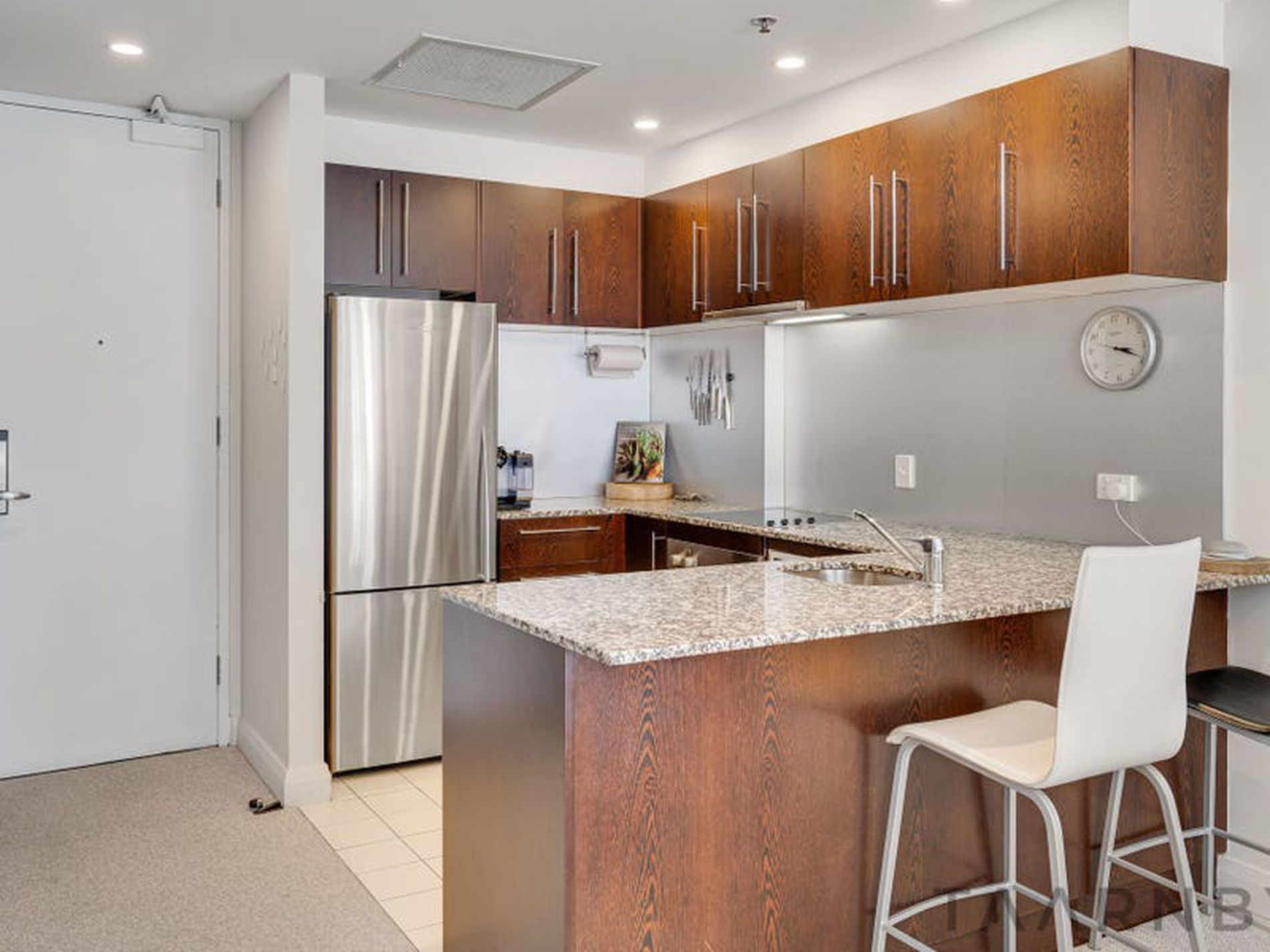 The stylish open plan living with a wraparound balcony, which has access from all rooms, affords great natural light and two outdoor spaces to enjoy the city skyscape. Hidden nicely behind timber feature doors, the European laundry blends in well with the extensive cabinetry whilst the well-appointed kitchen with Miele appliances including dishwasher has marble bench tops and a generous pantry.