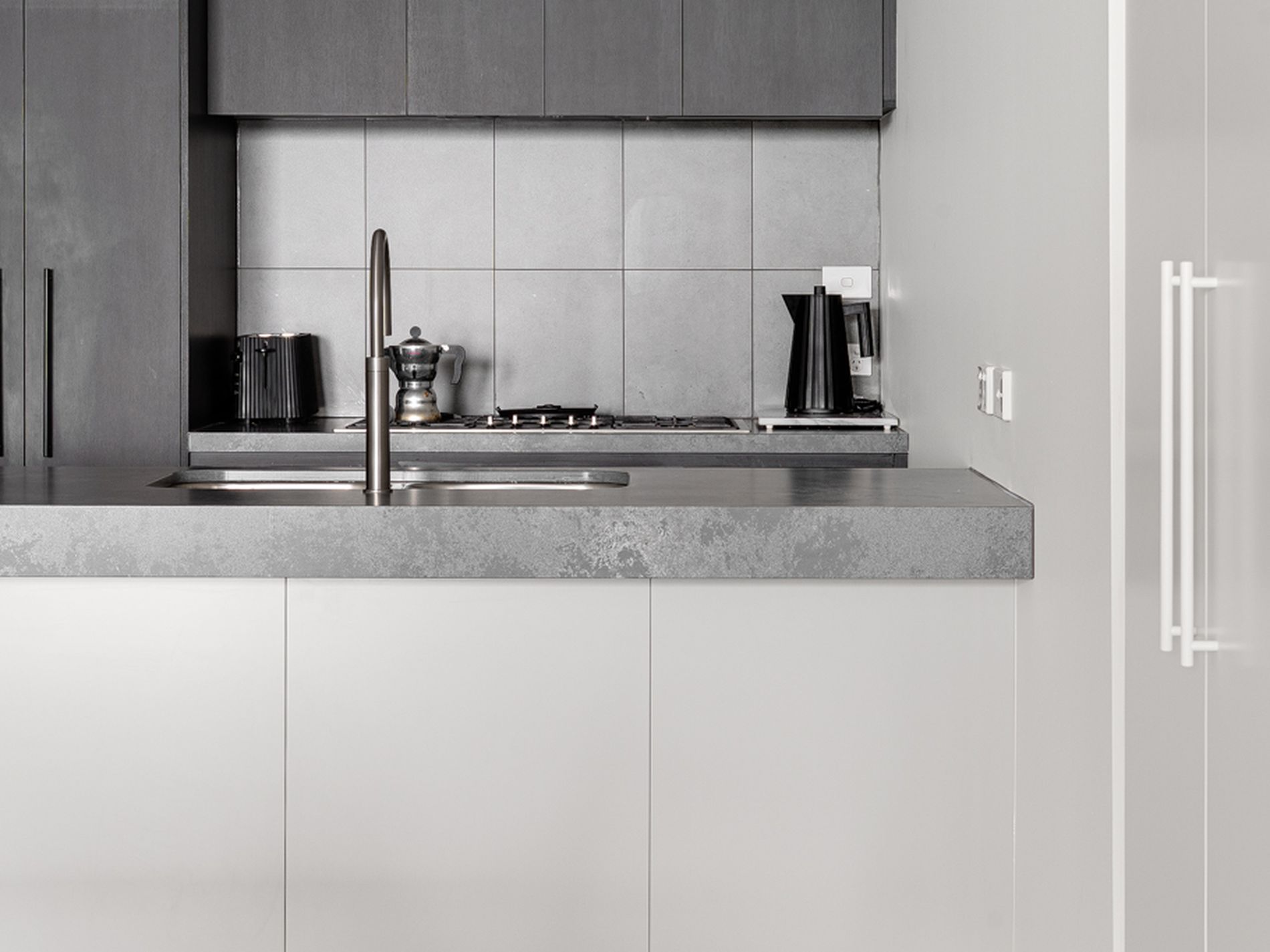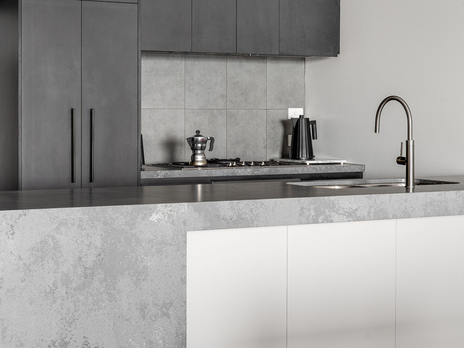 - Designer gourmet kitchen anchored by thick cut stone bench tops + breakfast bar, sleek charcoal cabinetry + gleaming premium appliances