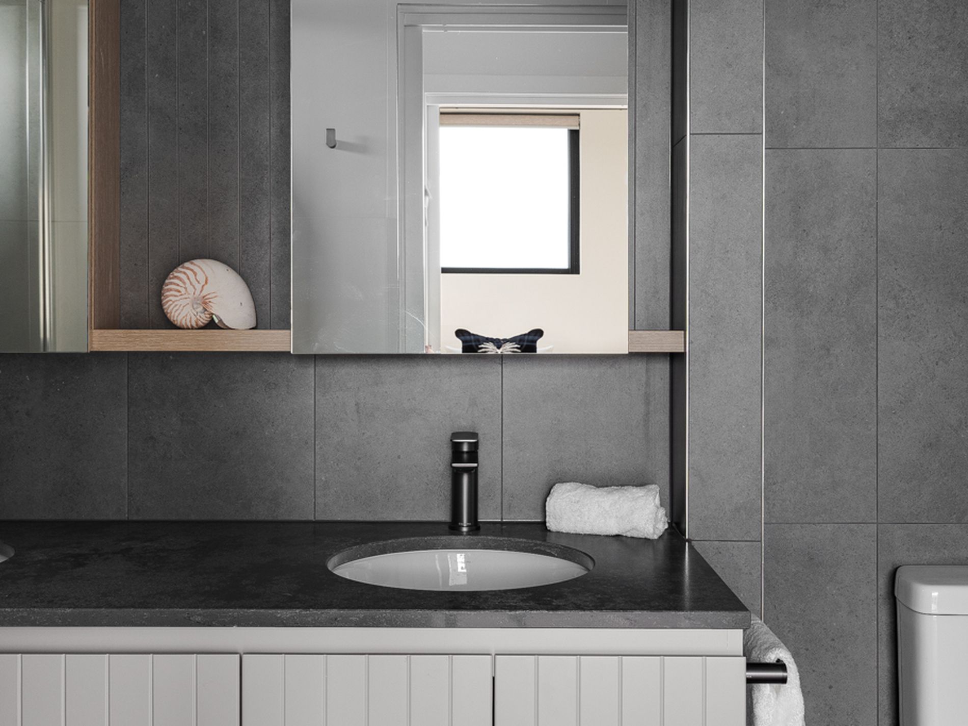 - Stylish guest bathroom with matching design aesthetic + separate laundry