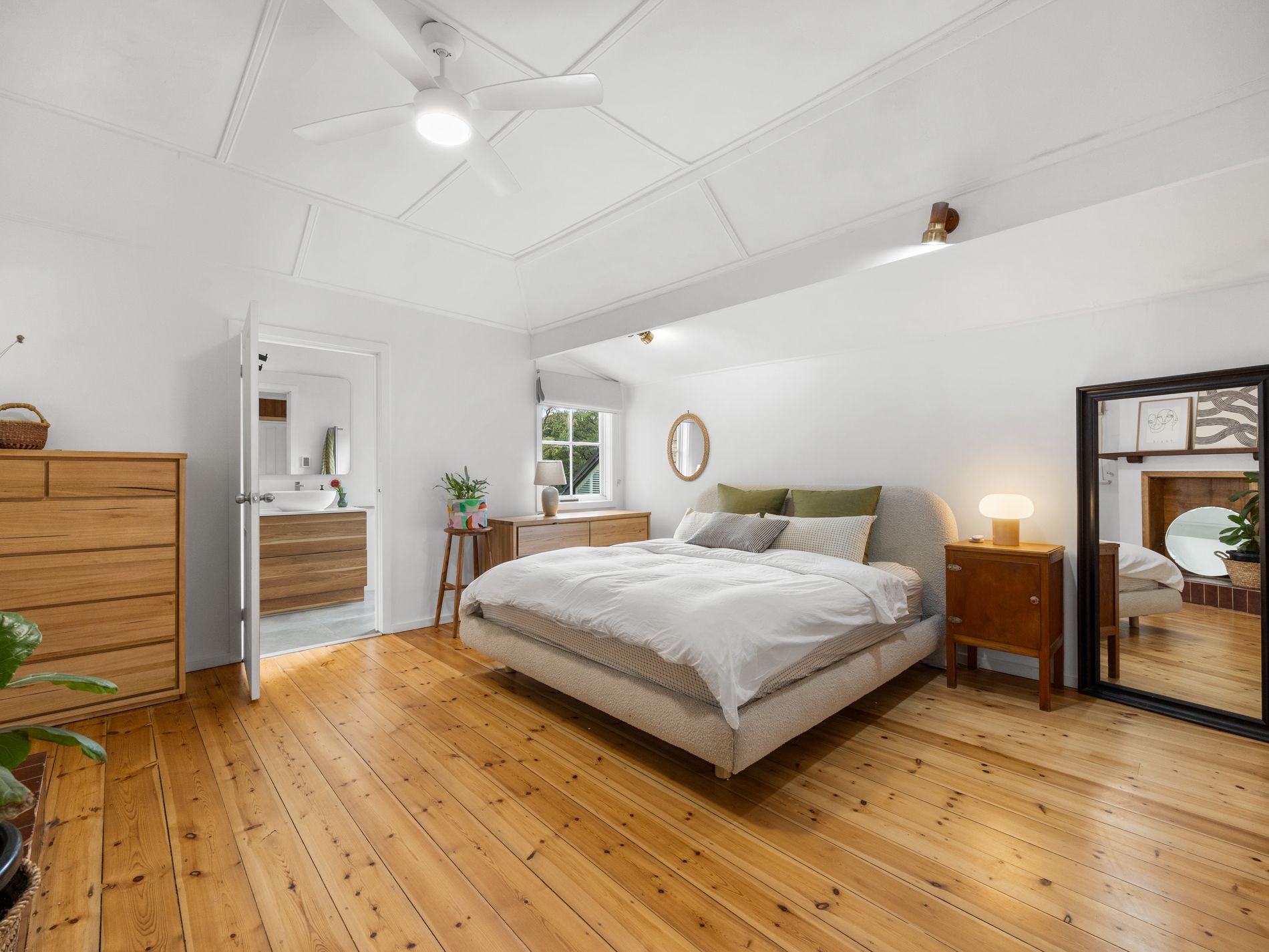 The vast open plan living zone lets you decide the layout, welcoming with exposed beams, whitewashed interiors, polished timber floors, and a cosy combustion fireplace. French doors all but guarantee you’ll hover half inside, half out for a grounding balcony existence that seamlessly extends your living space.