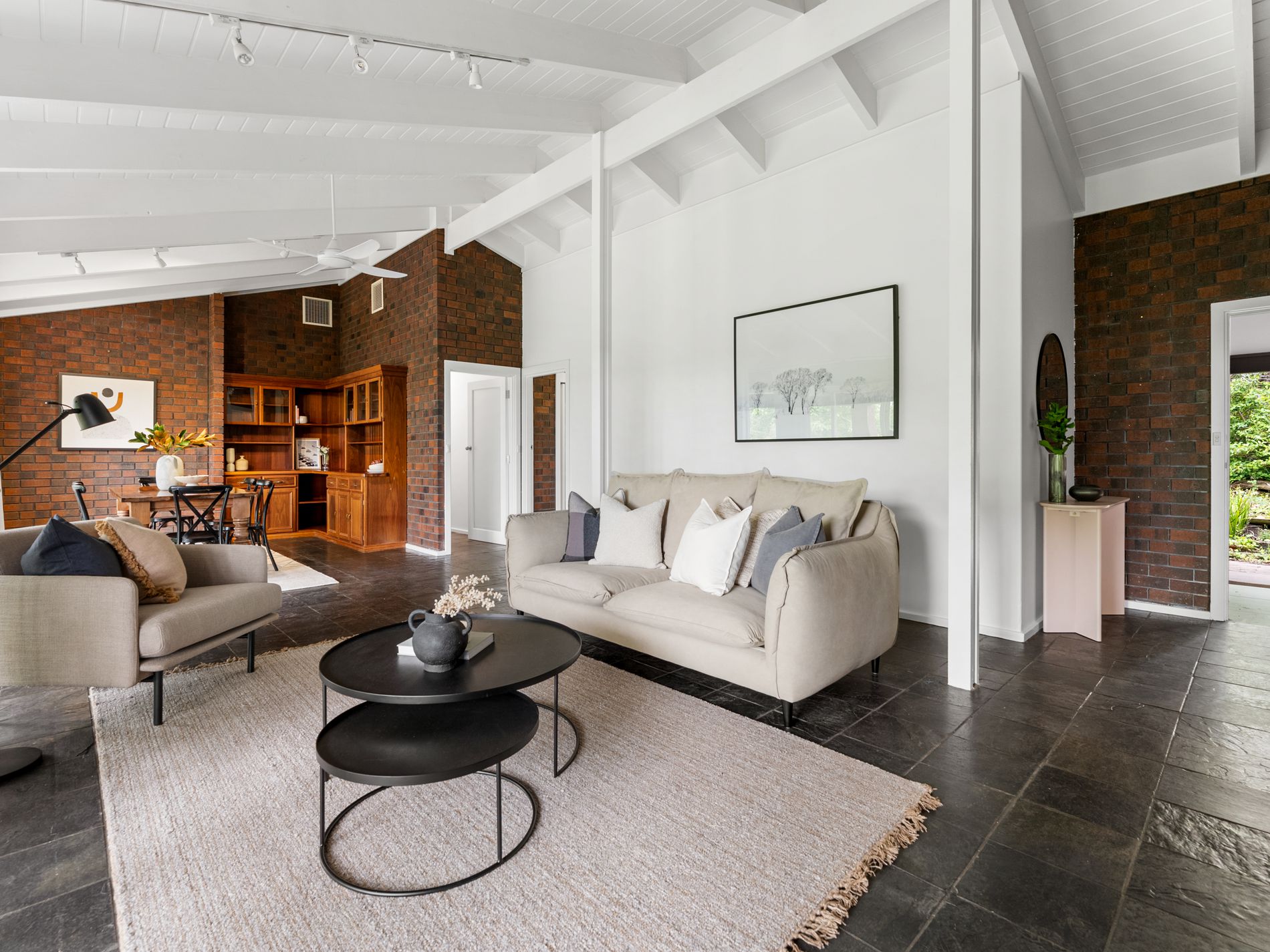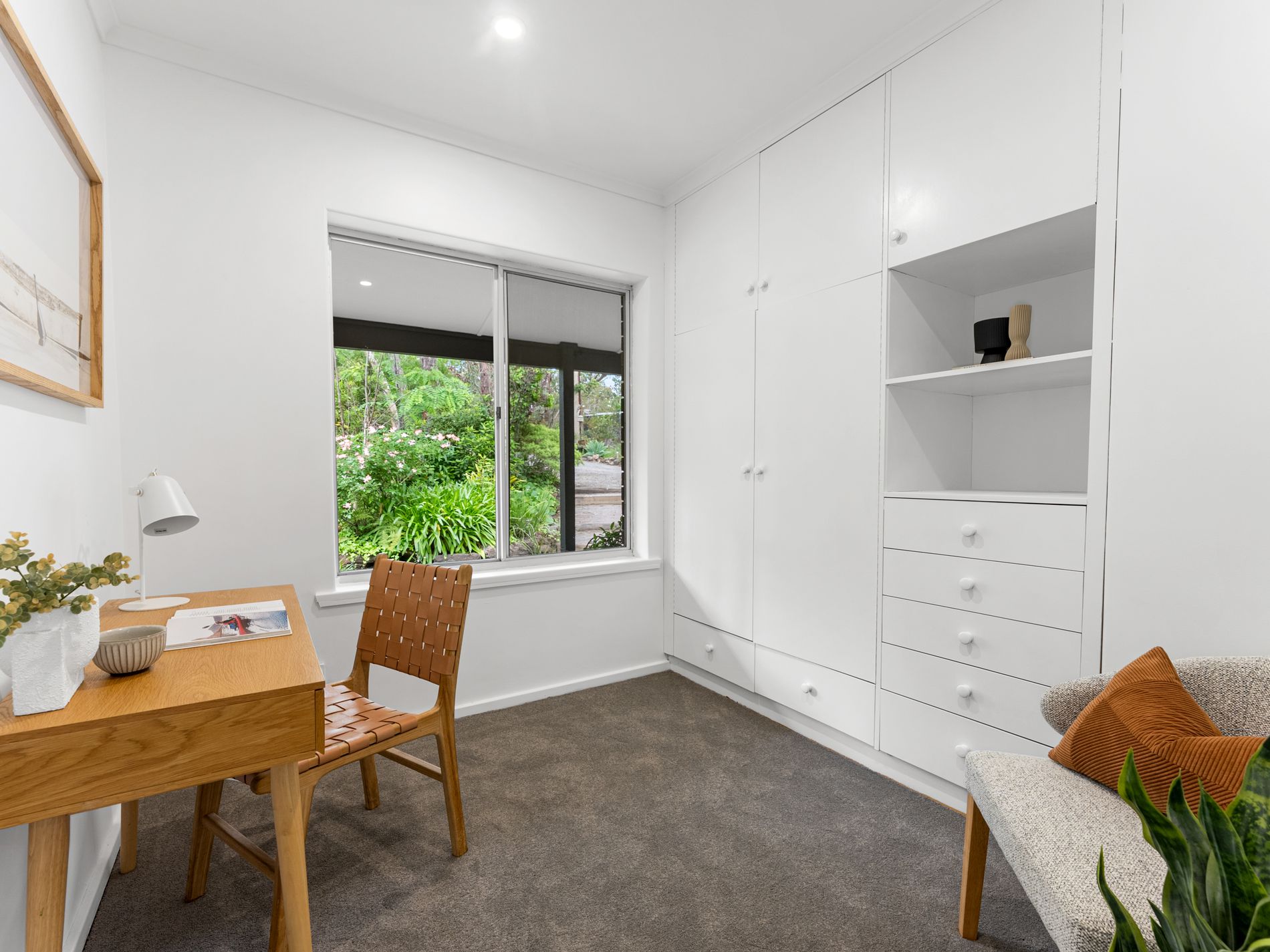 The lounge/ dining area has raked ceilings with feature beams and a soul warming slow combustion heater. The large main bedroom in the eastern wing has a walk in wardrobe and a new contemporary ensuite. You will wake up to birdsong and beautiful views from the expansive floor to ceiling windows. Across the living space and down the hall , bedrooms 3, 4 and 5 offer beautiful window wrapped tiered spaces that lend themselves to study spaces, reading nooks or sitting rooms.