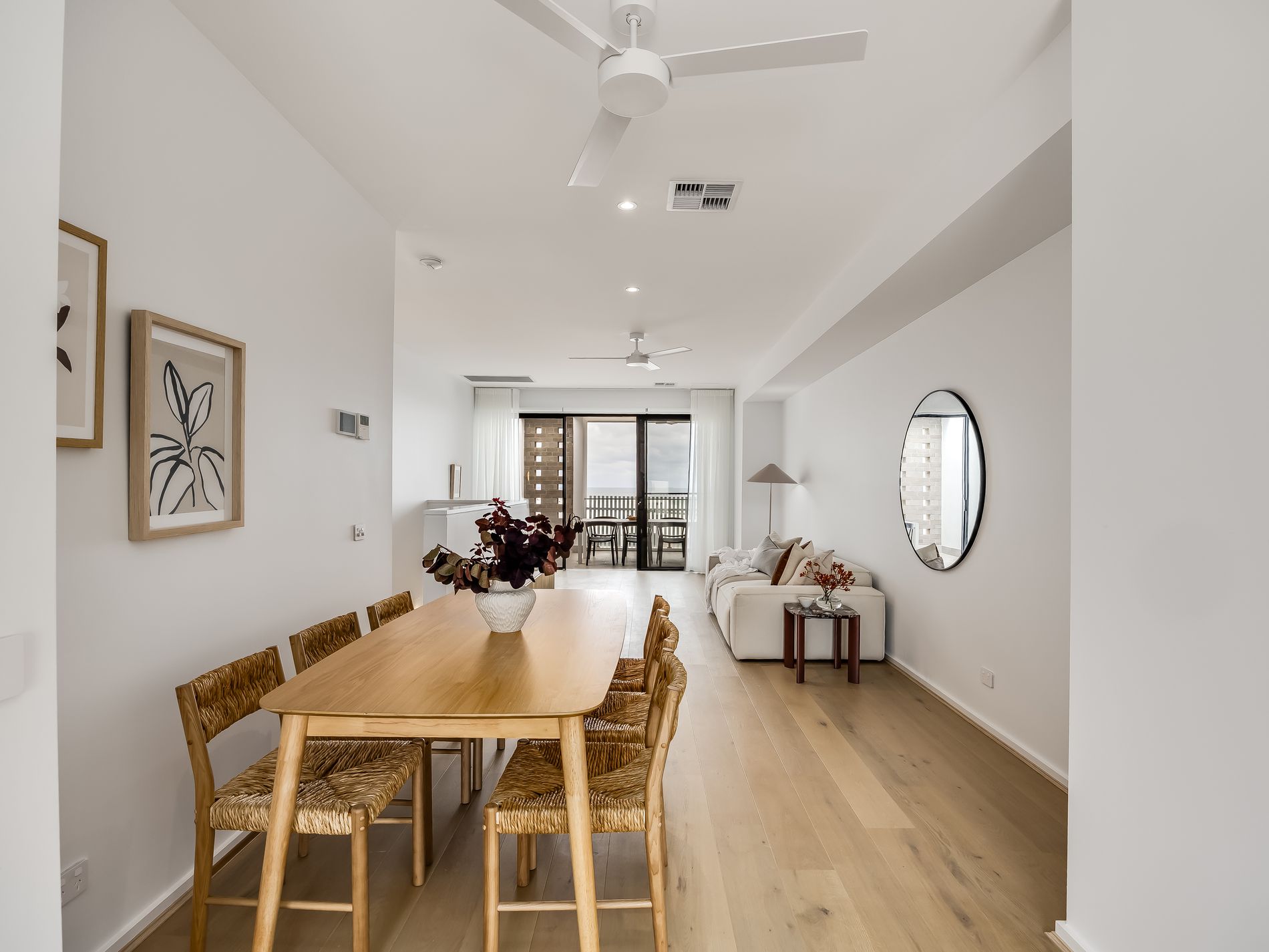 Level one accommodates robed bedrooms one and three. The primary suite faces the ocean, hosting an ensuite; bedroom three claims the central bathroom and a rear balcony with soothing sea breezes.