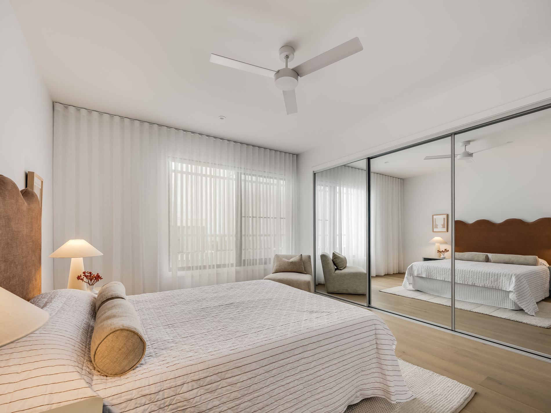 - First floor primary bedroom features full-length mirrored robes, TV point, a chic ensuite, soft sheers and motorised blinds