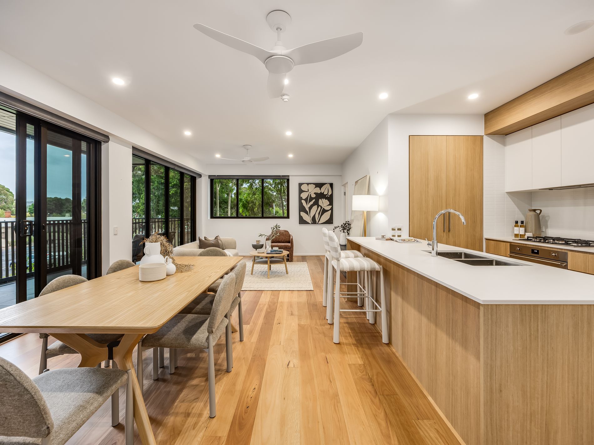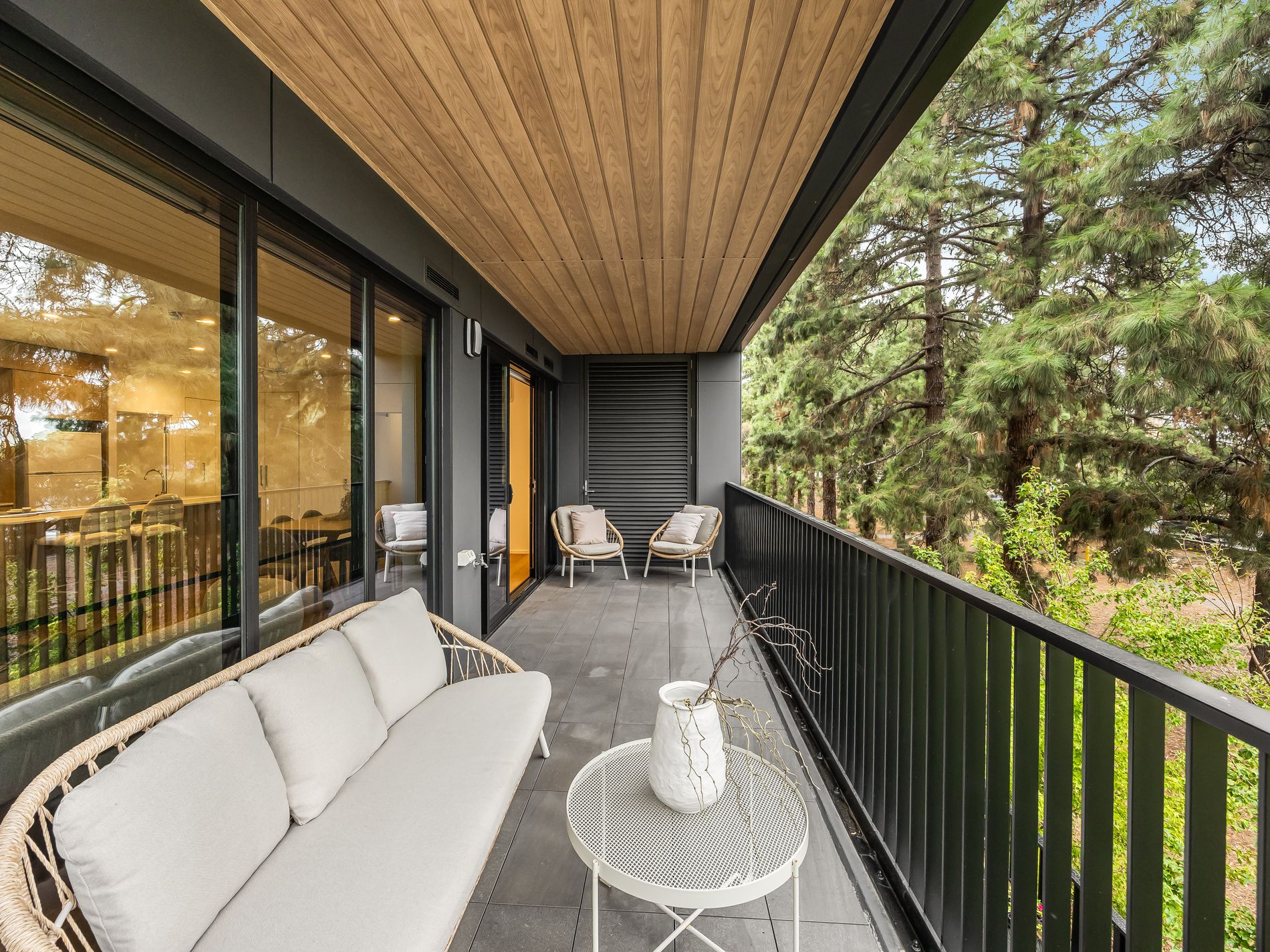 - Expansive balcony terrace/alfresco set behind wide glass sliders + gallery windows