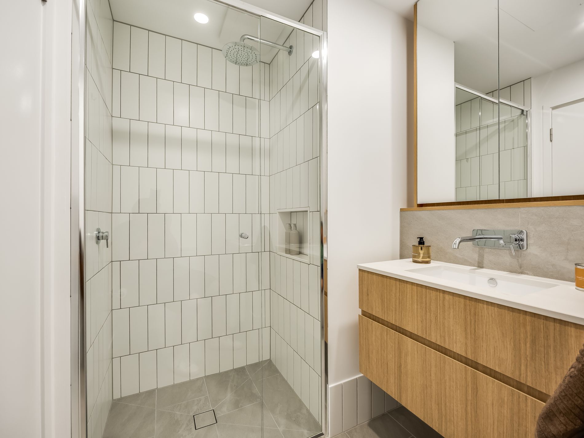 - Main bathroom, full-height shower tiling, wall-hung vanity and mirrored cabinetry.