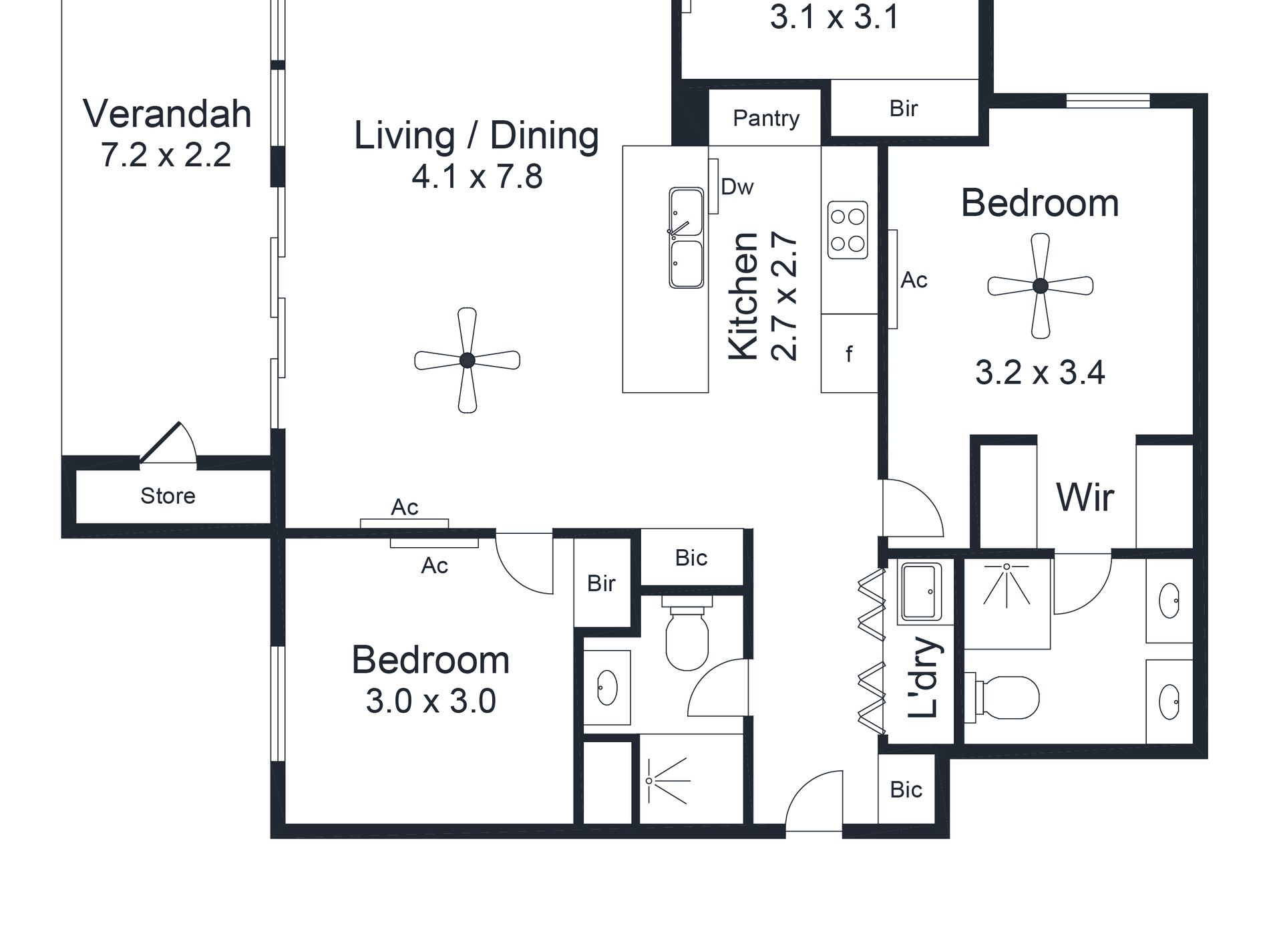 - 2 more bright + airy bedrooms, ceiling fans, AC + BIRs