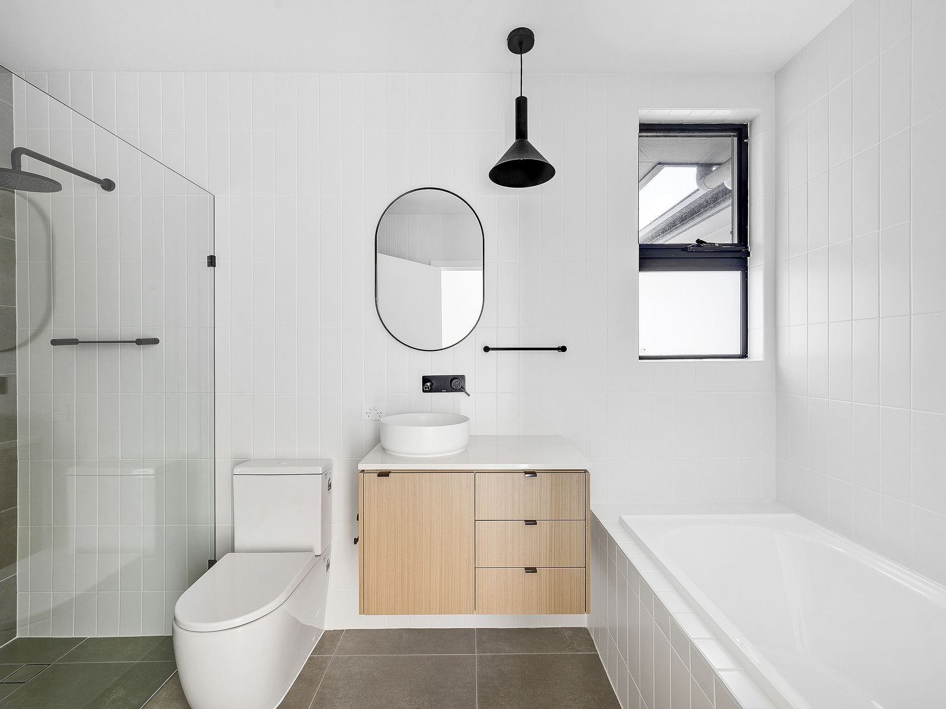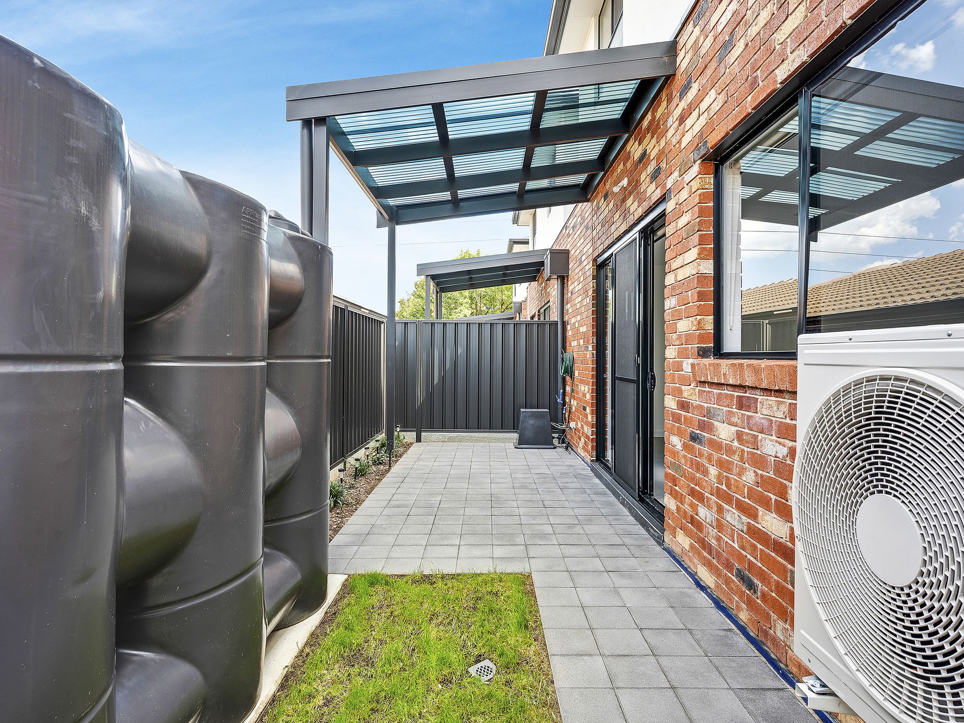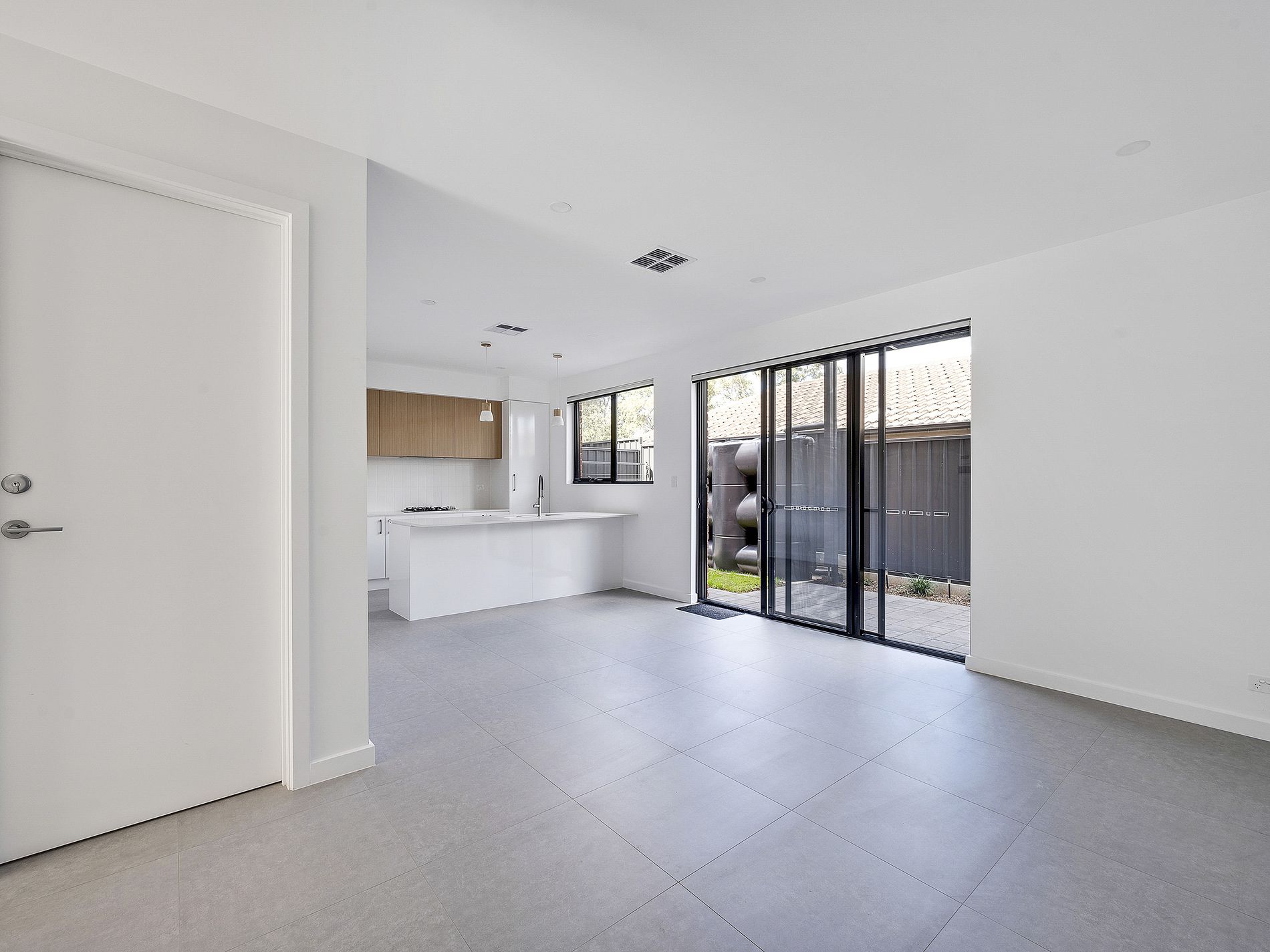 Sliding doors lead out to a private backyard with a covered veranda, creating the ideal space for outdoor dining or unwinding at the end of the day.
