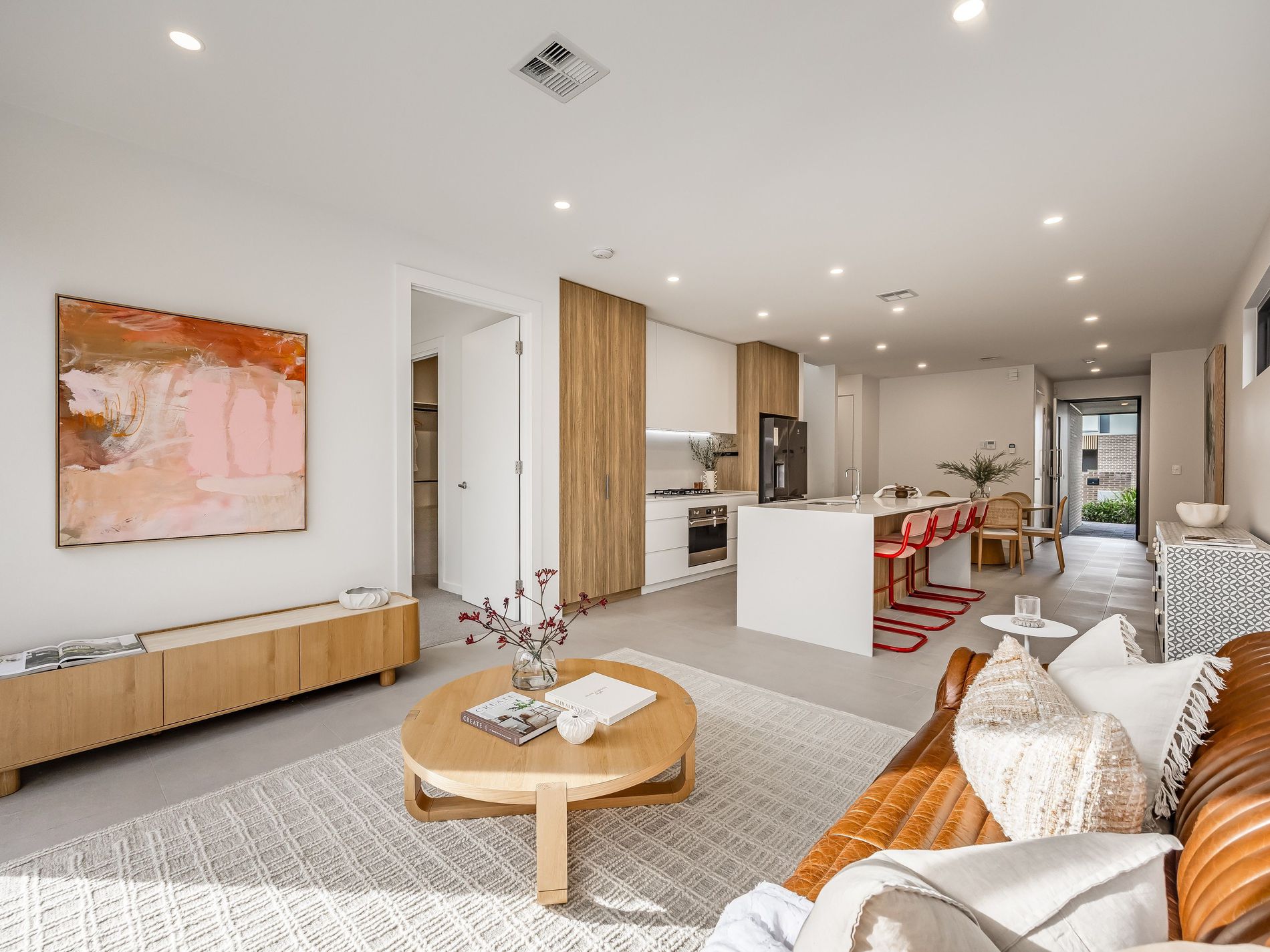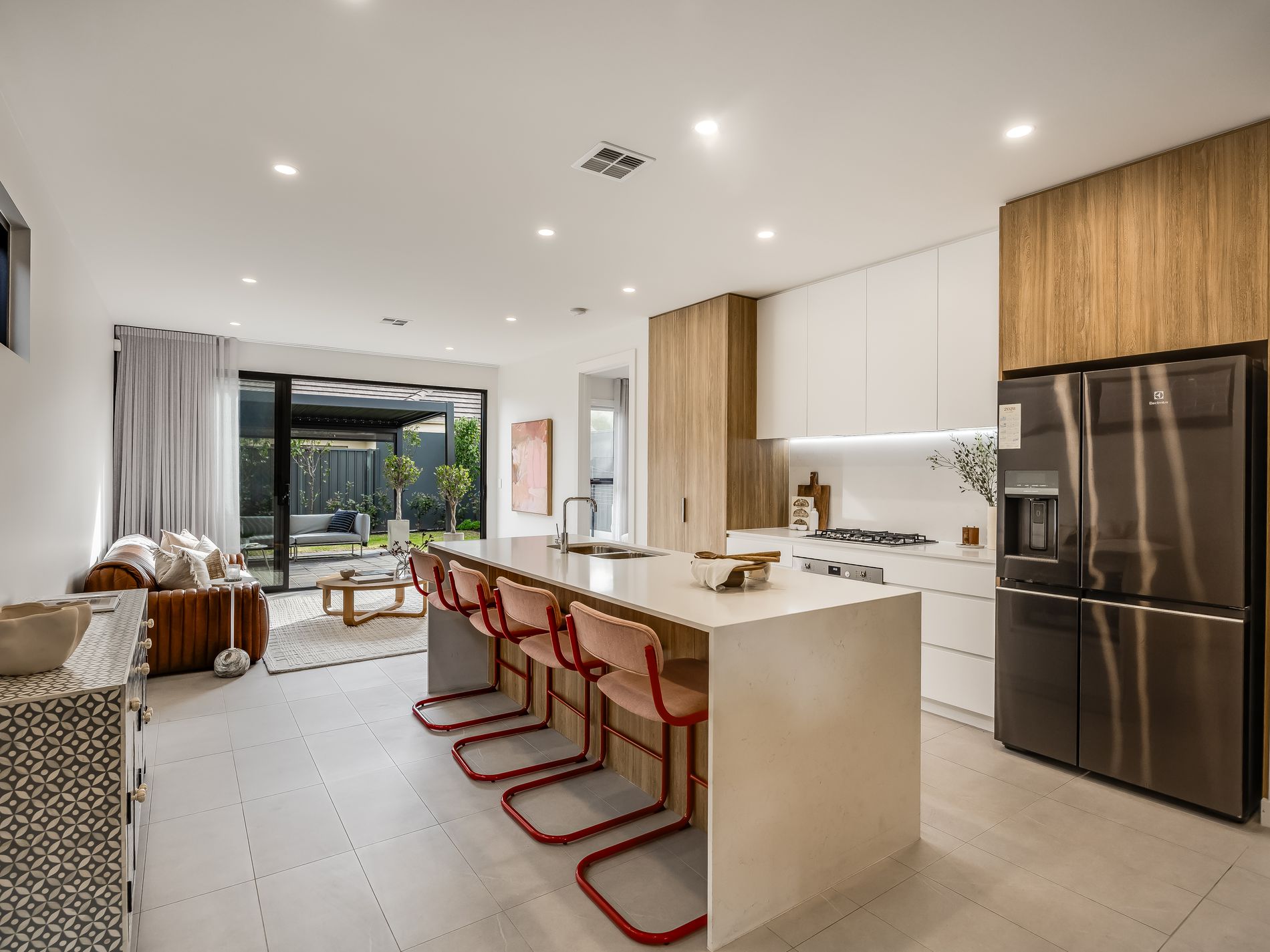 Inside, a calm, cohesive palette carries throughout, softening the home’s modern polish. The kitchen sits at the heart of it all — stone surfaces, streamlined joinery and Smeg appliances coming together in a space that’s as functional for families as it is for professionals. Living and dining wrap around the culinary centre, before opening out through wide sliders to a covered alfresco that extends the experience seamlessly. It’s a setting that handles quiet evenings comfortably or enjoy lively weekend gatherings just as fluently.