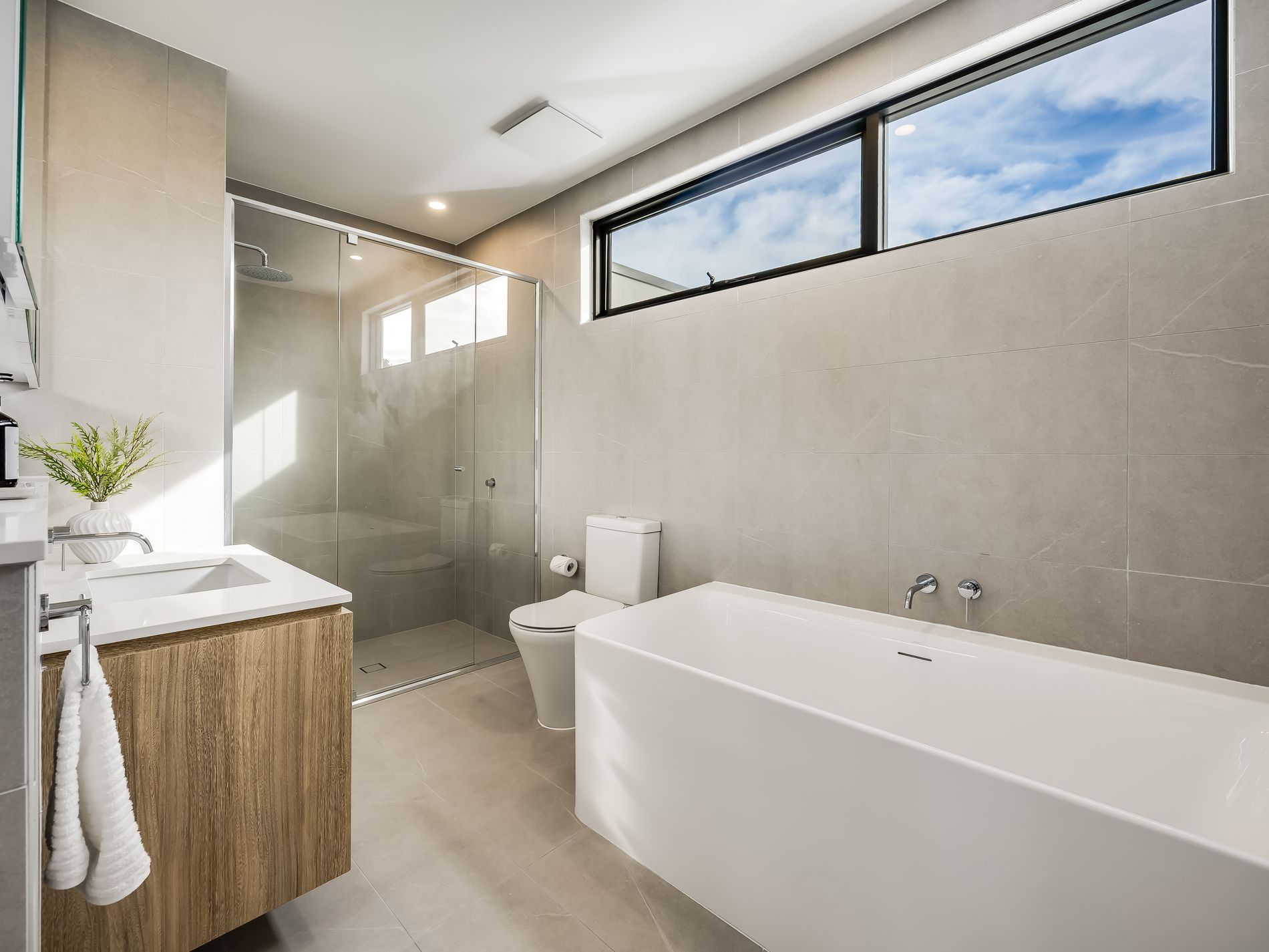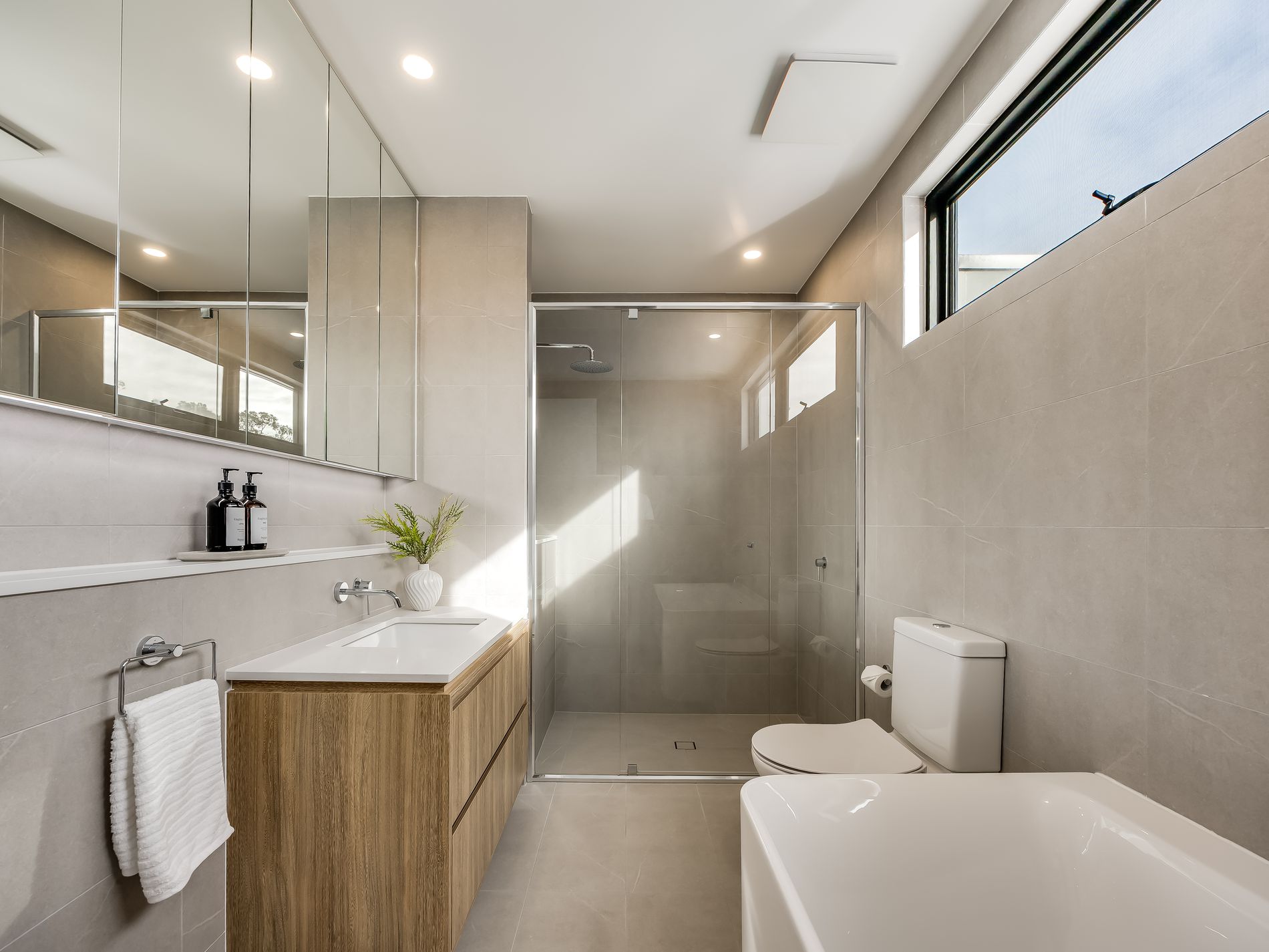 − Large main bathroom featuring separate shower + relaxing bath, full-height tiling, stone vanity, under-cabinet lighting