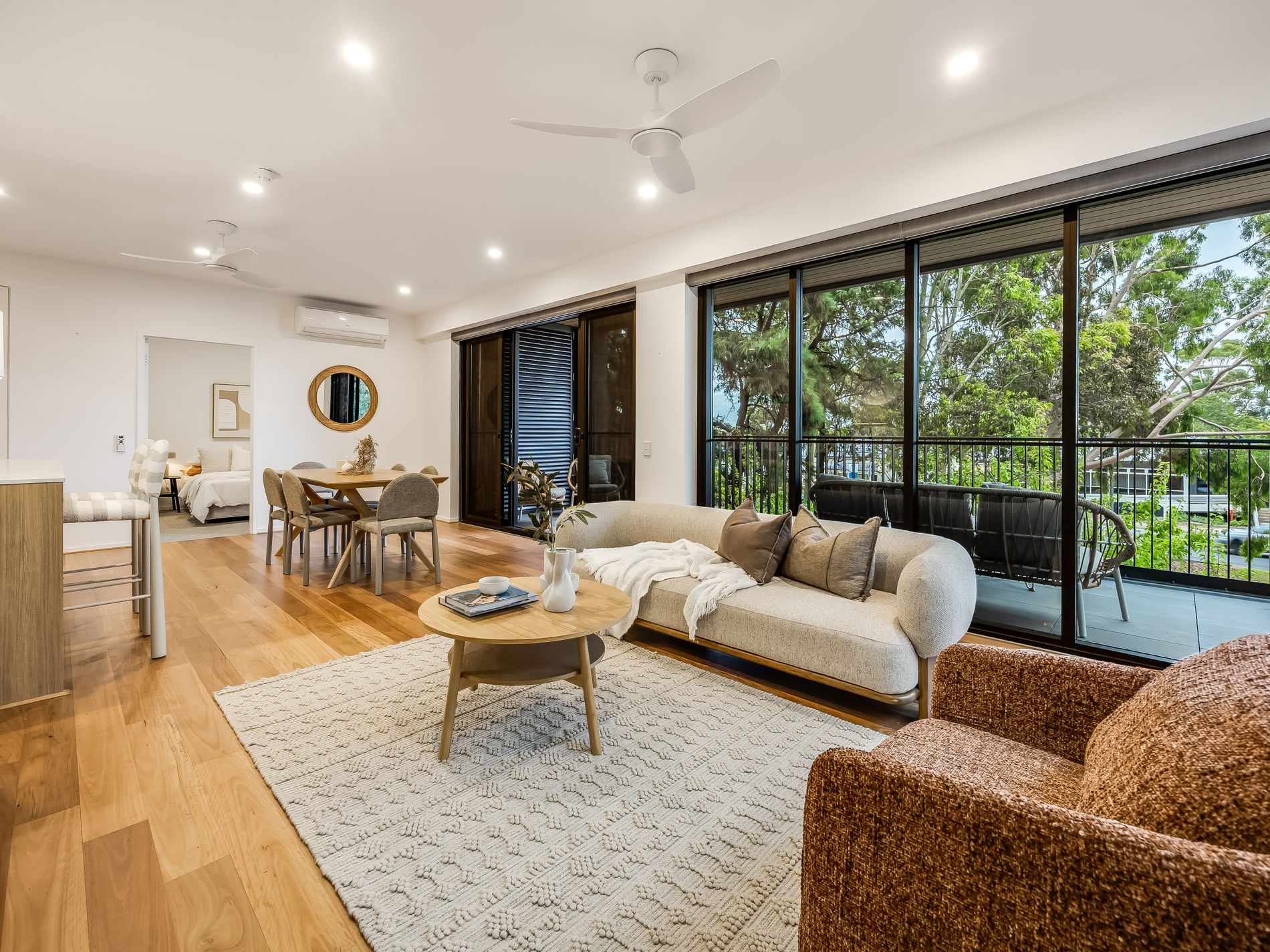 - Expansive balcony terrace/alfresco set behind wide glass sliders + gallery windows